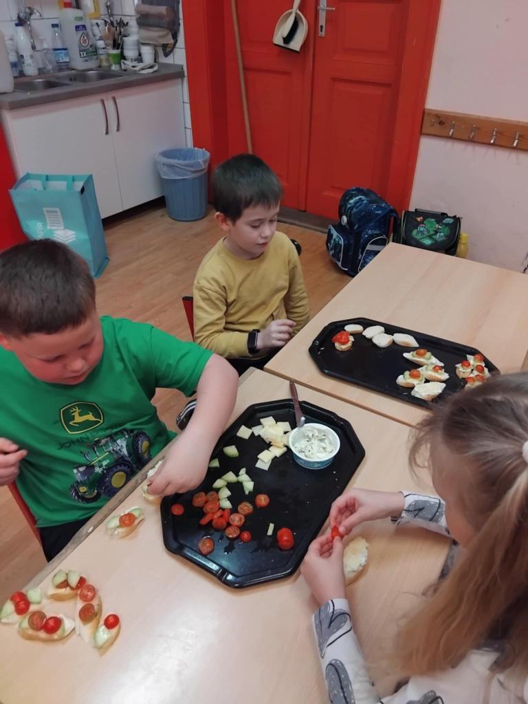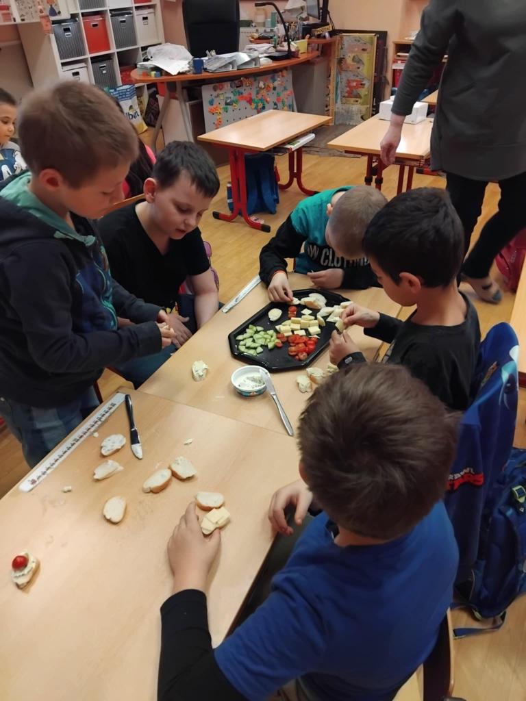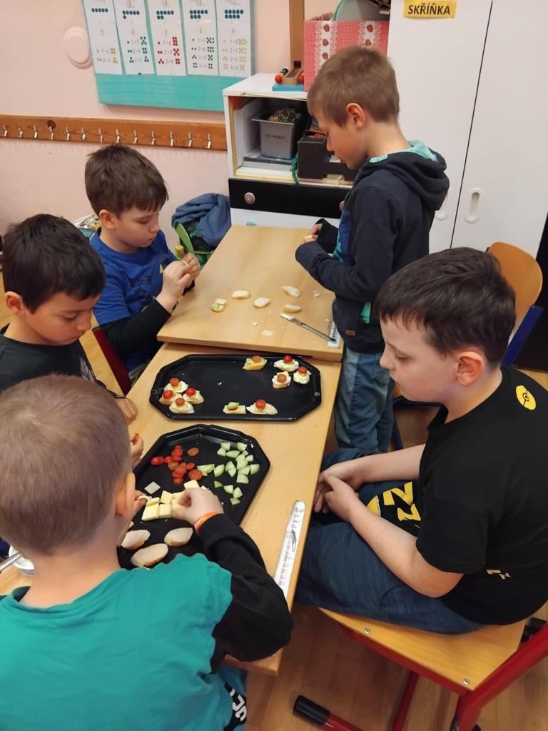 Díky projektu "Mléko do škol" si žáci mohli ochutnat různé druhy sýrů a žervé. Pak už stačilo dodat jen pár rohlíků, trochu zeleninky, ozdobit dle vlastní fantazie a jednohubky byly na světě :o)
